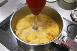 - バーミックス(ミンサー)でなめらかなポタージュにする。牛乳を加え、塩こしょうで味を調える。