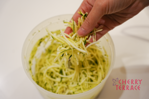 - ズッキーニ、にんじんはそれぞれバーミックス(スライシー/ブレード2)で細切りにする。塩もみし水気を切る。
