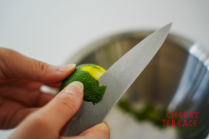 - 青柚子と青唐辛子はよく洗って水気をしっかりと拭き取る。青柚子はヘタを取って皮をむく。白いワタの部分はなるべく丁寧に取り除く。※青唐辛子を扱う際は辛味で手が痛くなるので手袋をした方が良いです。