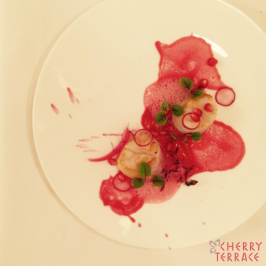 ホタテのポワレとビーツのピューレ フランボワーズの泡