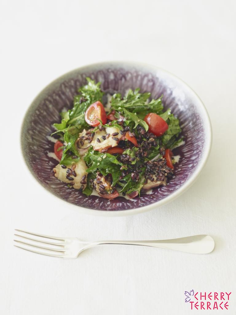 【たことベビーケールの黒米サラダ】 黒米と薄切りのたこ、ベビーケールとミニ... -