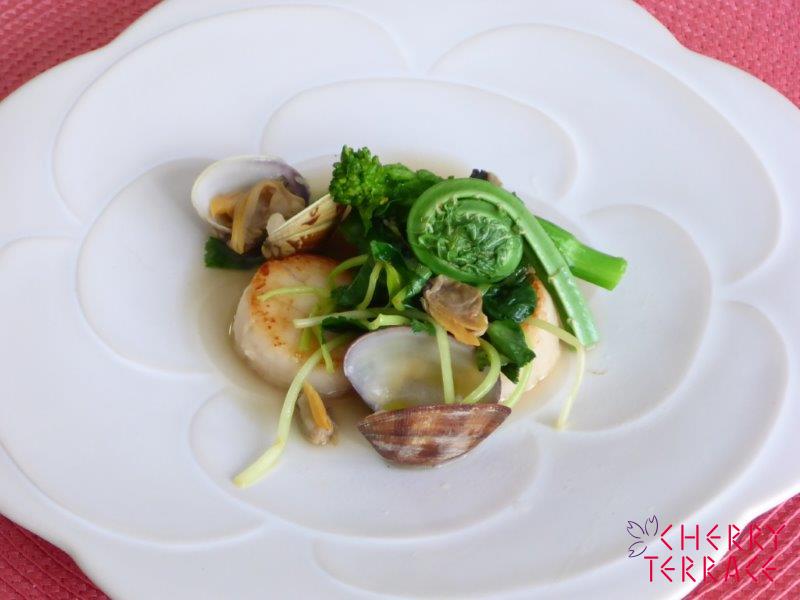 【帆立貝のポワレ アサリソース 春の菜と共に】 あさりの旨味がぎゅっと詰ま... -