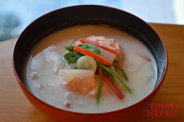 【サーモンつみれの粕汁】 酒粕によって馥郁たる佳香を堪能し、また春の訪れを... -
