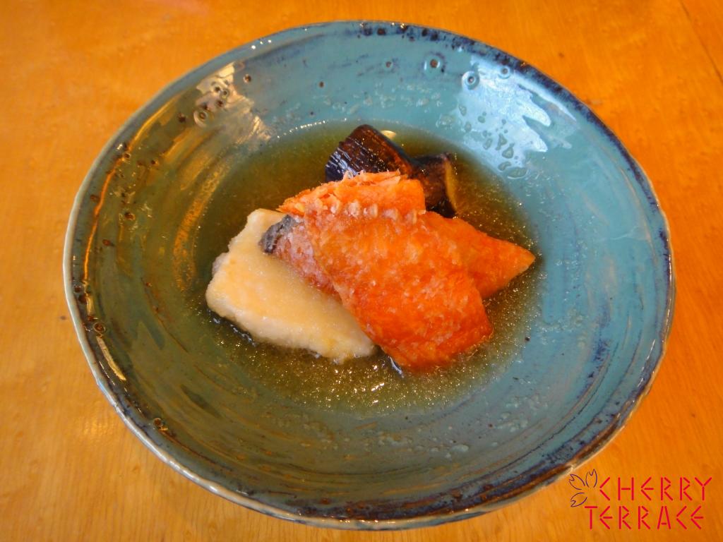 【サーモンとなすの揚げ出し】 彩りもよくボリューム感もある揚げ物です。サー... -