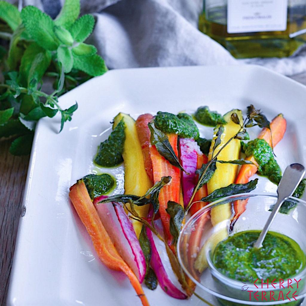 【ハーブと人参のロースト 春菊ジェノベーゼソース添え】 濃厚でフレッシュな... -
