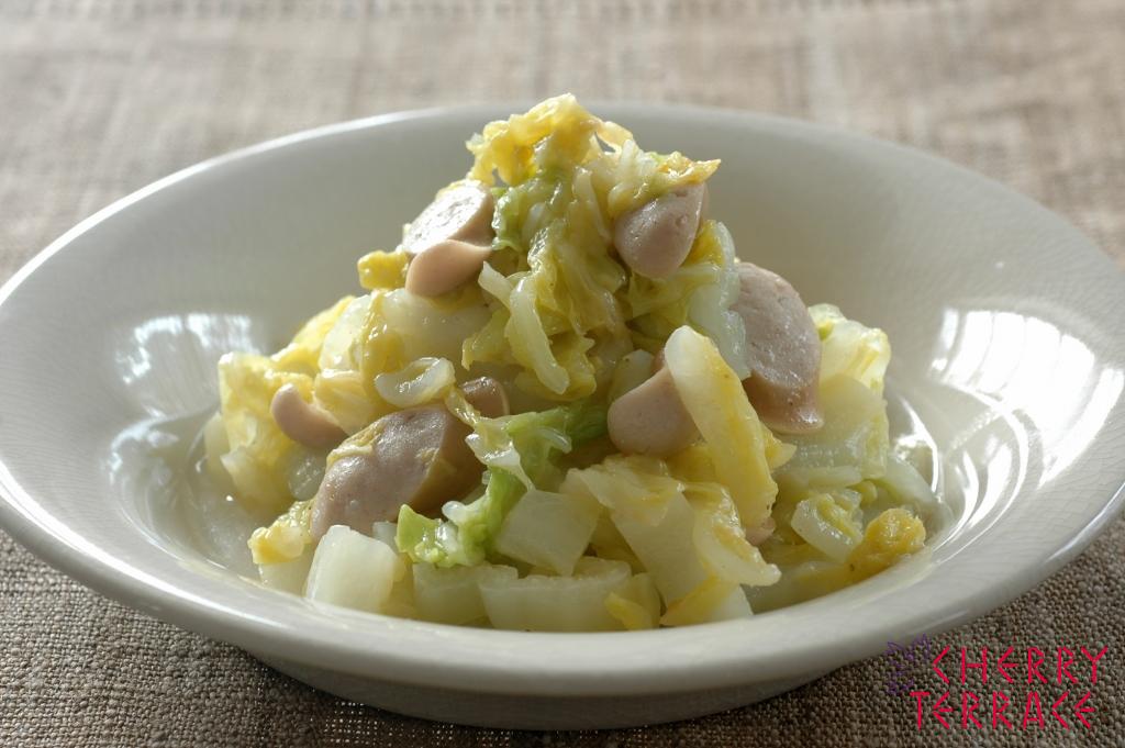 【白菜とソーセージの蒸し煮】 蒸し煮調理はクリステル鍋の得意技。たっぷりの... -