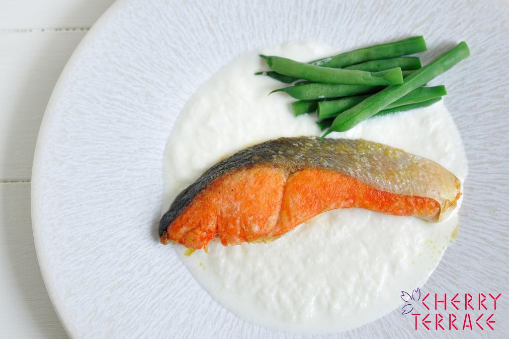 【サーモンソテー カリフラワーソース】 カリッと焼けた鮭と、カリフラワーを... -