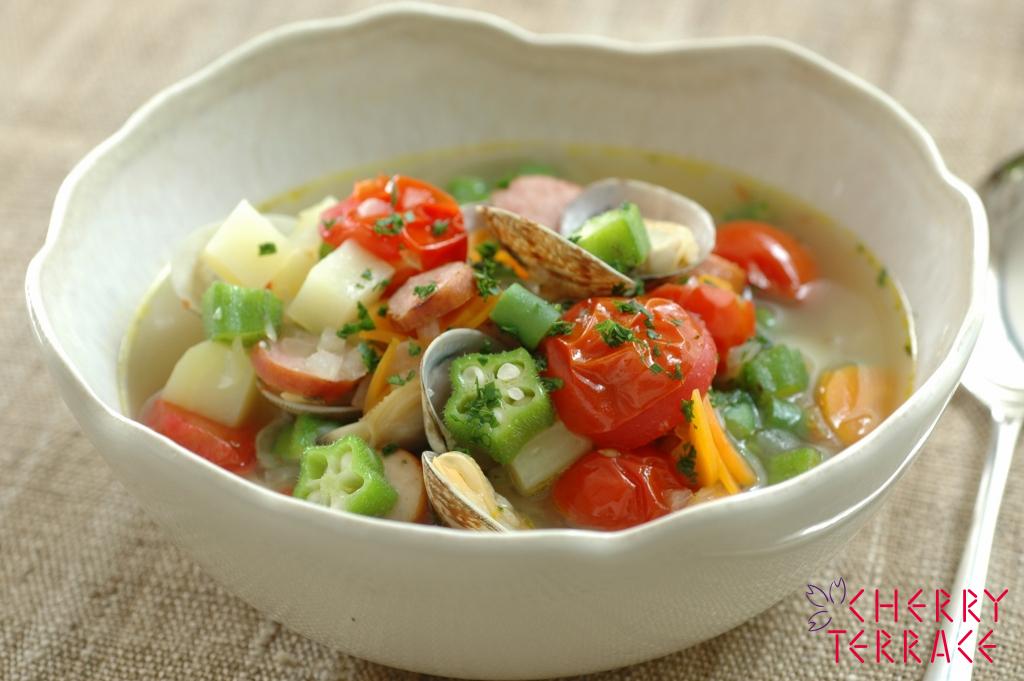 【あさりと夏野菜のスープ】 あさりのだしが効いた具沢山スープ。あさりのだし... -