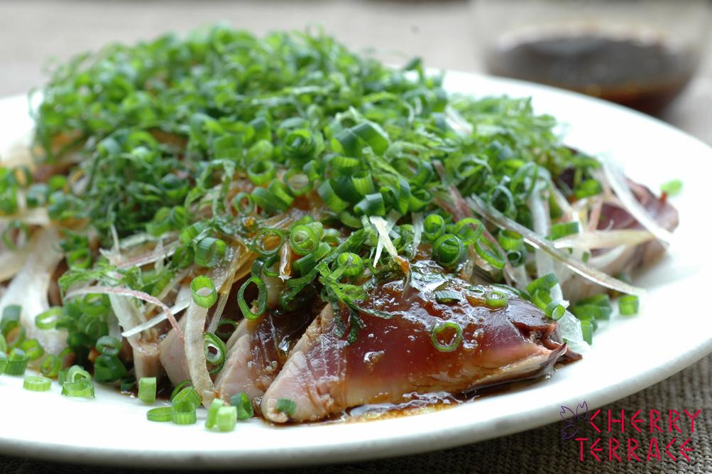 【かつおのたたき】 比較的脂の少ない初鰹は、表面をラウデミオ(EXV.オリーブ... -
