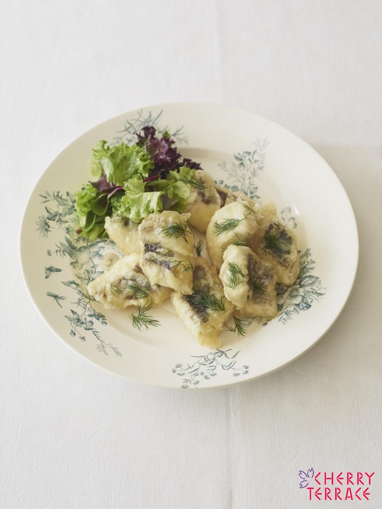 【白身魚のフリット】 添えたハーブサラダにもたっぷりとレゼルヴァをかけてお... -