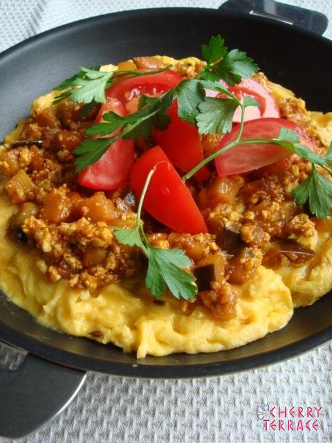 【豆腐カレーのオムレツ】 豆腐となすのドライカレーを添えたオープンオムレツ... -