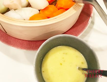 【根菜蒸し 塩すだちドレッシング添え】 せいろで蒸した根菜を、塩すだちの香... -