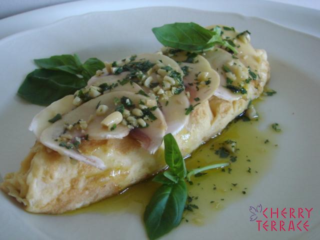 マッシュルームのオムレツ 松の実とバジリコのオリーブオイルソース
