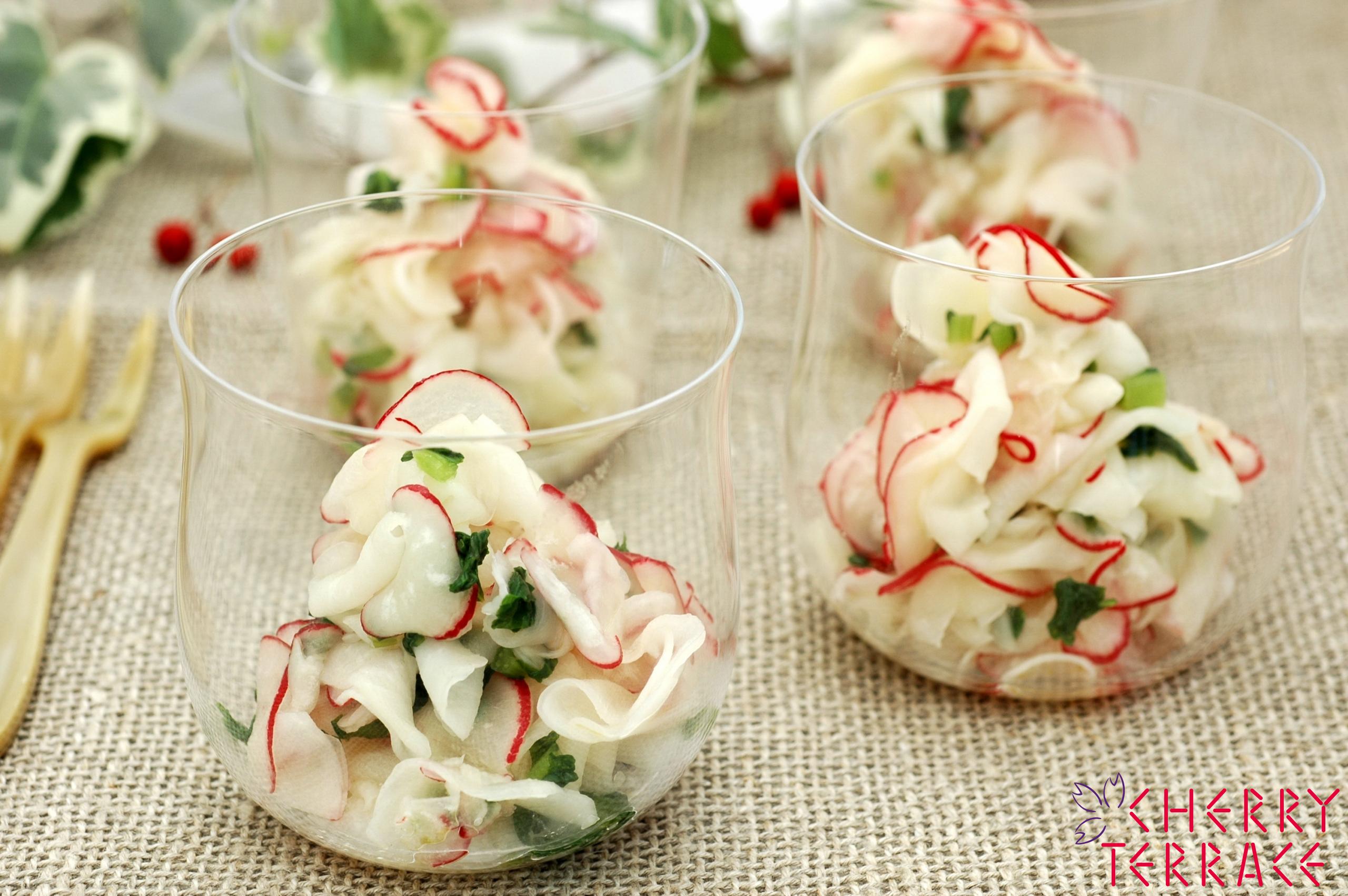 - かぶとラディッシュはそれぞれバーミックス(スライシー/ブレード4)で薄切りにする。塩をふり、かるくもんでしばらく置き、水気をしぼる。