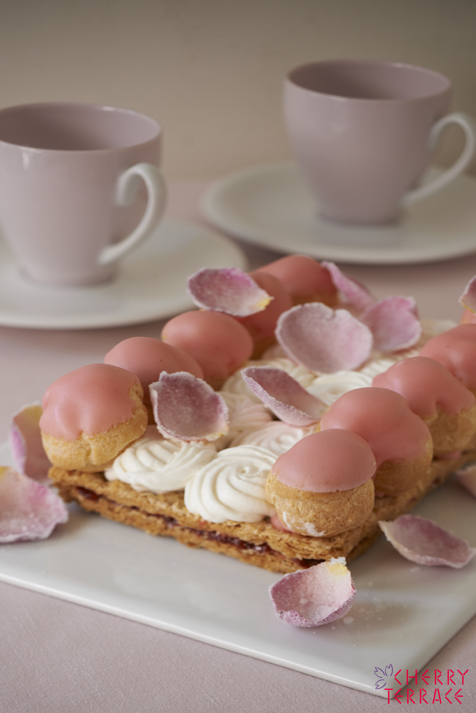 - パイを焼く。材料を2回に分けて撹拌した練りパイ生地をそれぞれ2mm厚さにのし(焼き上がりを12X20cmに切れるように)、天板にのせてフォークで沢山の空気穴をあけ、200度のオーブンで5分ほど焼く。さらに浮きすぎないようにケーキクーラーにのせて約20分焼き、温度を180度に下げて約10分焼く。2枚のパイをそれぞれ12X20cmに切り、ラズベリージャムをはさむ。