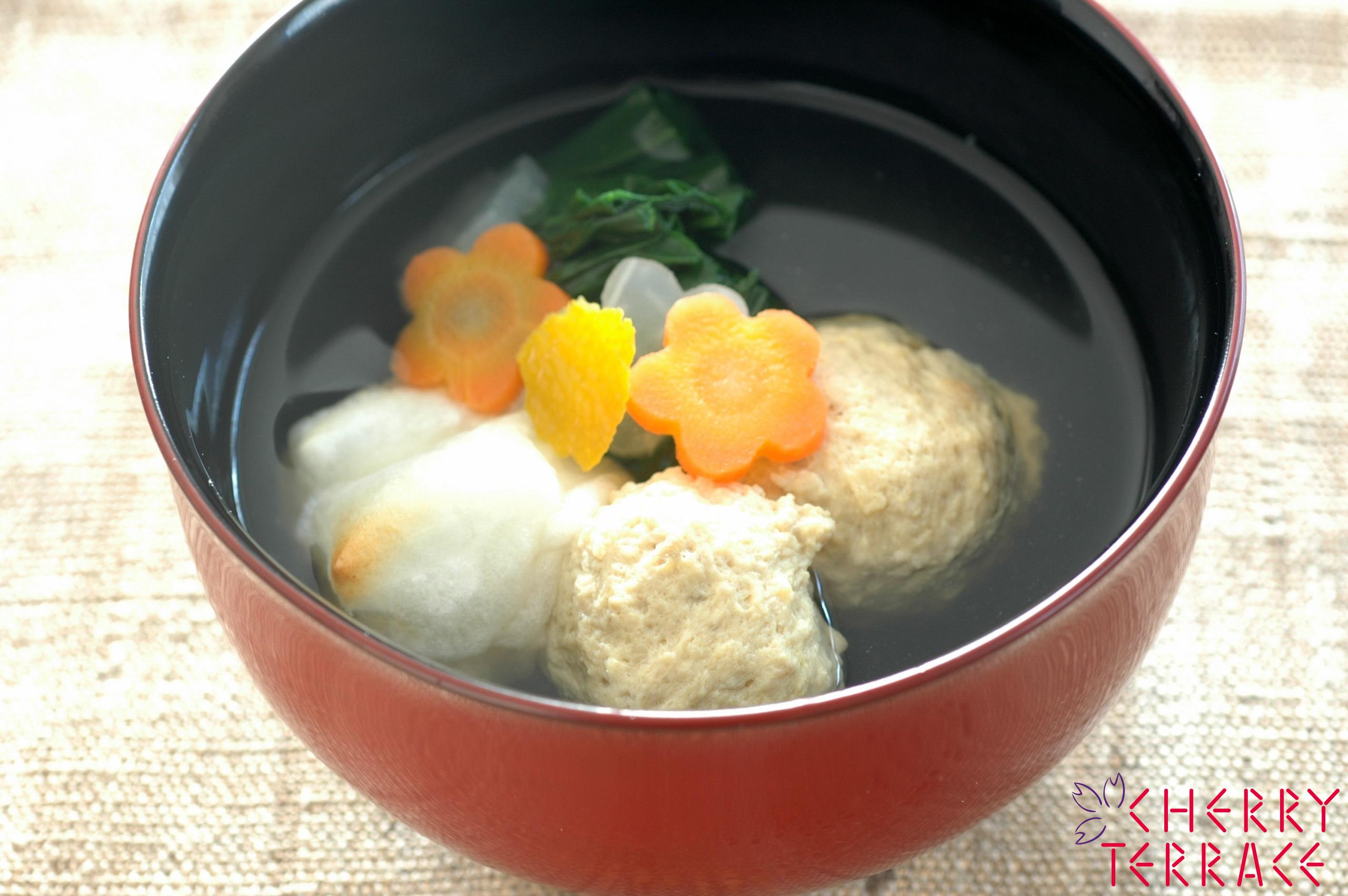- すまし汁用のだし汁に梅型の大根、にんじんを加えて煮立て、1の半量をスプーンでまるめながら入れて煮る。塩、薄口しょうゆで調味する。