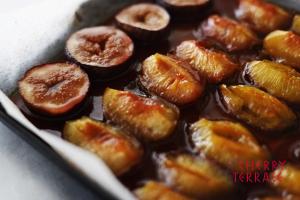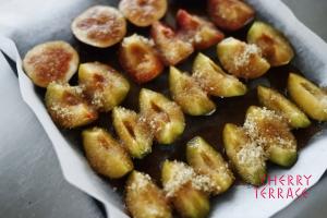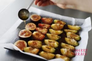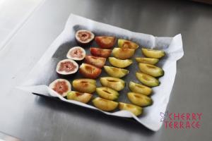 - いちじくはへたの部分を切り、横2等分する。プルーンとソルダムは種の周りを一周するようにナイフを入れ、種を中心に実をねじるようにしながら2つに分ける。1切れを半分に切り、種を外す。オーブンは200°Cに温めておく。天板にオーブンシートを敷き、切り分けたフルーツを並べ入れる。