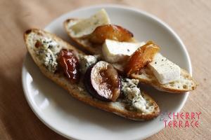 - 小ぶりのバゲットを2等分して軽くトースト。ほぐしたブルー系のチーズを置き、コンポートを乗せる。もう1種類は、薄めに切り分けたカマンベールを置き、コンポートを乗せたもの。フルーツジュースを炭酸で割ったり、紅茶やハーブティー、ワインにも。
