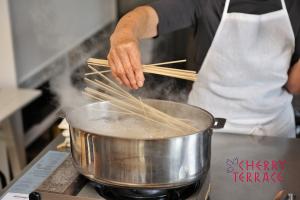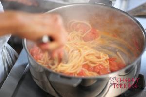 - 少し塩分が強めのお湯でスパゲッティをアルデンテになるまで茹でる。