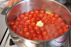 - クリステル浅鍋26cmにラウデミオをひき、にんにくとプチトマトの断面を下にして底面いっぱいに並べ、火をつける。
