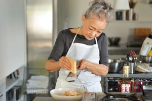 クリステルの中で有元葉子さんが最もよく使われるのは、浅鍋とのこと。「パスタを作ることが多いので、ソースを作りやすく、パスタと和えやすい浅鍋はとても使いやすいわね」とお褒めを頂戴しました。このレシピのポイントは、パスタをゆでるときに塩をたっぷりめに使って、野菜ソースには塩を加えないこと。その方が野菜の味をしっかり楽しめるのだそうです。シンプルながらしみじみおいしい一品です。