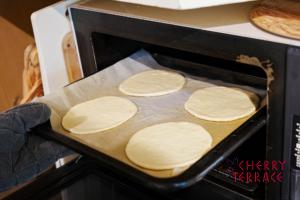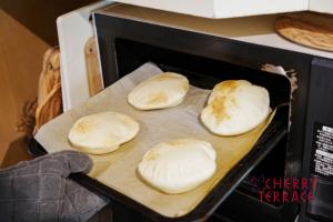 - オーブンシートに4を並べ、オーブン内の天板に滑り移し、上段で3分ほど焼く。(風船のようにふくらみ、一部に焼き色がつくくらいが完成です)