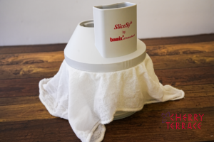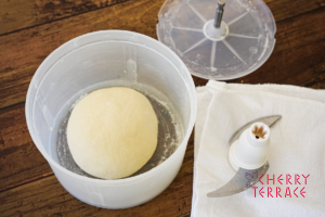 - 丸めた生地を戻し、濡れ布巾とスライシーのふたをのせる。そのまま約1時間、2倍くらいの大きさになるまで発酵させる。