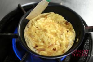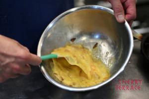 - フライパンで米油を熱し、半熟の卵焼きをつくる(下を焼き固めたスクランブルエッグの様な火入れ)。