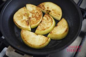- りんごは皮をつけたまま1cmくらいに横にスライスし、半分に切り分ける。フライパンにラッコルトを少し垂らし(分量外 約小さじ1/2ほど)、弱火にかける。ラッコルトが馴染んできたらりんごを並べ入れ、弱めの中火でじっくりと両面を焼く。