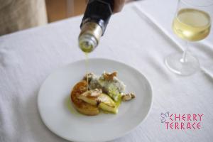 りんごを少量のラッコルトでじっくり両面を焼き、ざっとほぐしたブルーチーズを添えてラッコルトを回しかけるだけ。りんごはじっくり焼くことで引き出される甘さも魅力。