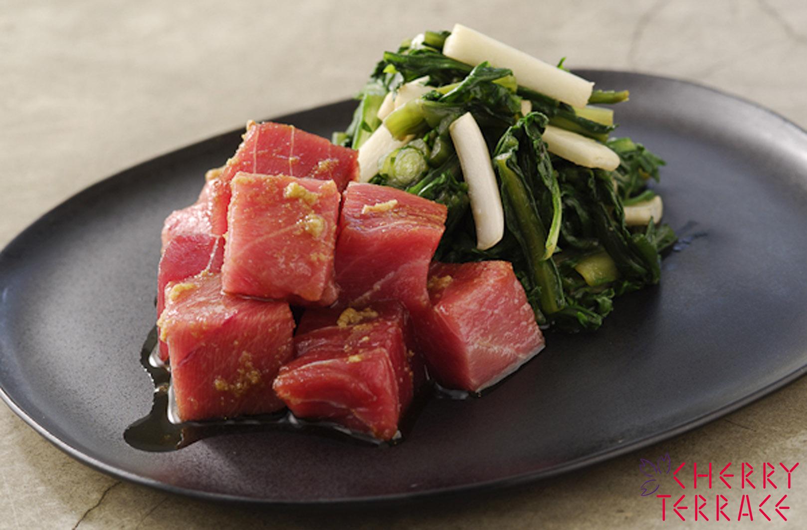- ボウルにおろしわさび、しょうゆをとき、オリーブオイルを加えて混ぜ、そこへまぐろを入れて和える。
