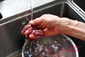 - ボウルに流水をためて3を入れ、心臓の中の血まできれいに洗い流す。何度か水を替えて洗い、2とは別のざるに上げる。