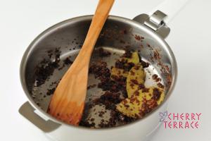- 5分たったらふたを取り、弱火にして水分を飛ばしながら炒める。植物油が足りないようであれば適宜足す。