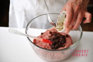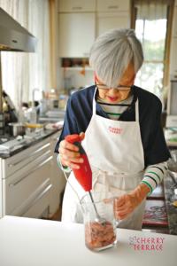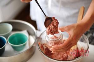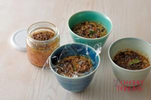 - 空き瓶、ココットなど深さのある容器を煮沸消毒して12を詰める。すくい入れるごとに、容器をゆすったり、底を手の平に打ち付けたりしてしっかりと空気を抜く。