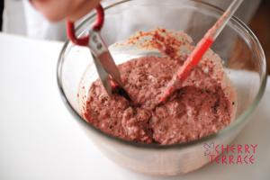 - 大きなレバーのかたまりが見つかったらキッチンバサミで切って混ぜる。
