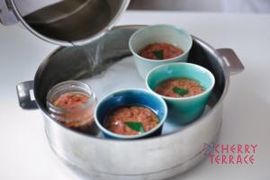 - クリステル浅鍋に布巾を敷いて14を並べ、熱湯を注ぐ(瓶に入ったレバーペーストの高さと同じくらい湯を張れると理想的です)。
