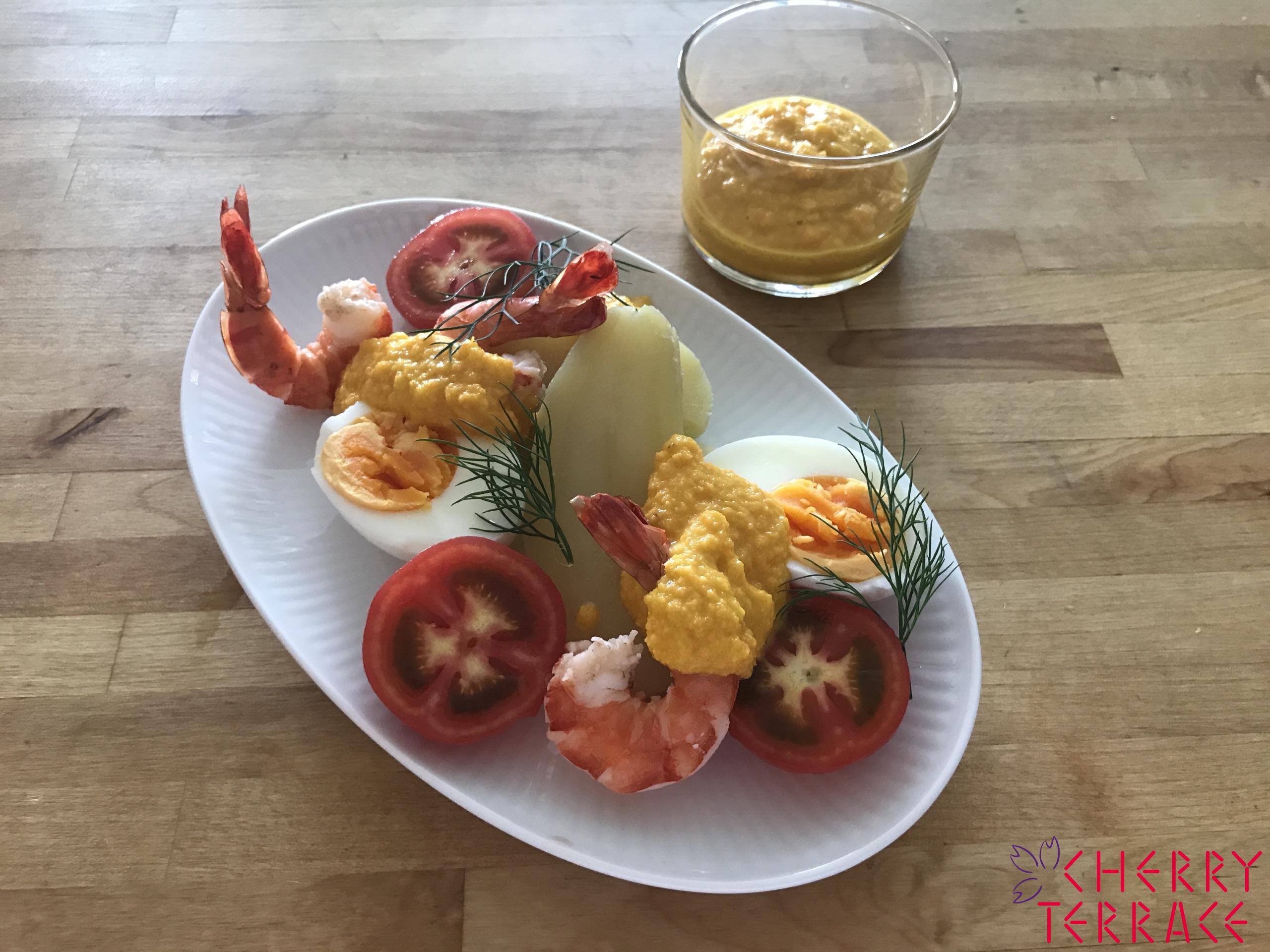 - 皿に野菜、えびなどを盛り付け、ドレッシングをかけてできあがり。