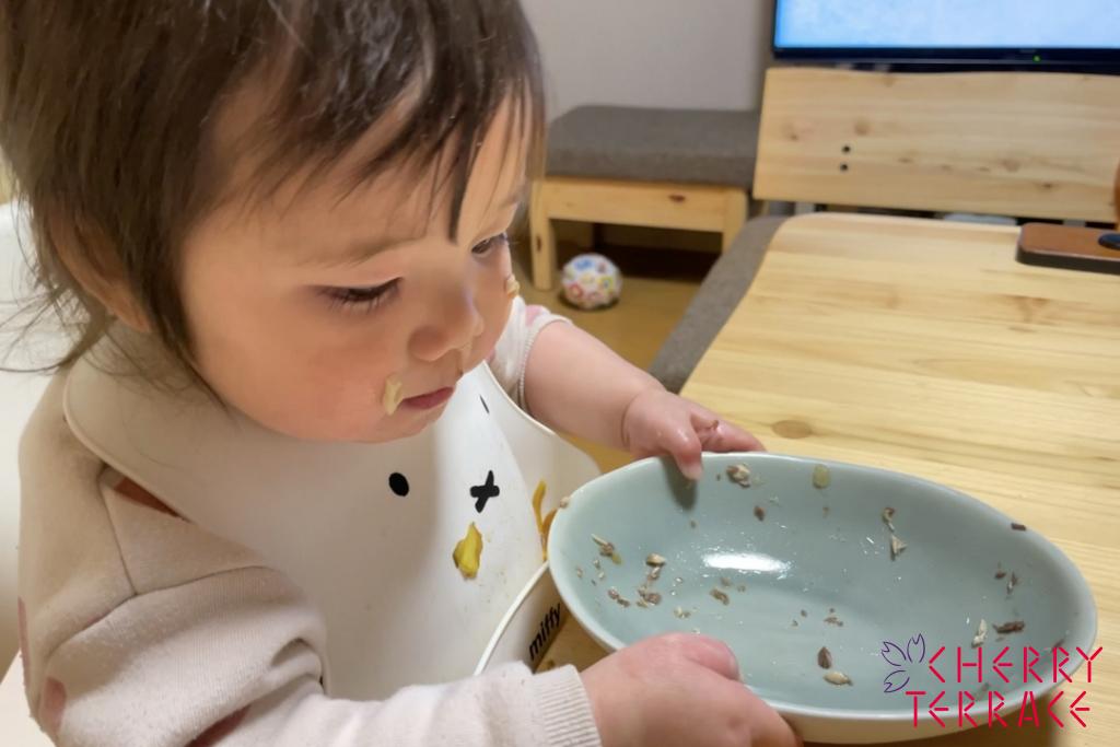 ※食べるペースが早すぎるのでペースを落とすと泣いて機嫌が悪くなるのでゆっくり食べてもらうためにテレビを見せる時もあります。