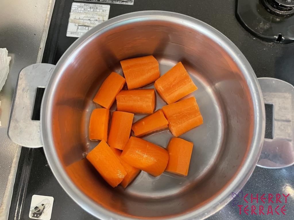 ① クリステル深鍋14cmに適当な大きさに切ったにんじん(1本分 )と少量の水を入れ、で10分〜15分蒸すように茹でる。