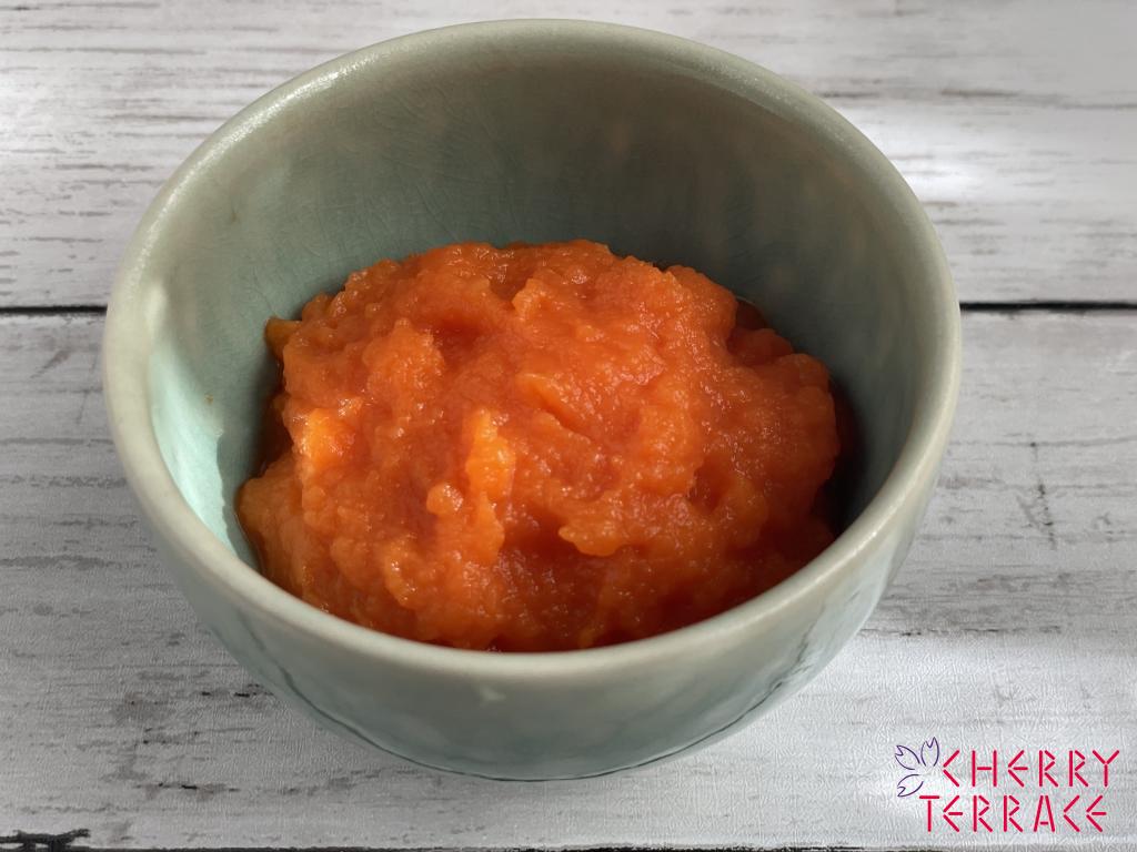 ・野菜は、普通に茹でるよりも少ない水で蒸すように茹でると素材の旨みが十分引き出され、何も味をつけなくてもとても味わい深くなります。しかし、つぶした時に少し硬めのペーストになってしまい、結局白湯などを足して調節することになるので、離乳初期の場合は鍋の1〜2cmくらいまで水を入れて茹で、茹で汁ごとつぶしてもいいと思いました(後から分かりましたが、ペーストがゆるい方が食べやすそうでした)。