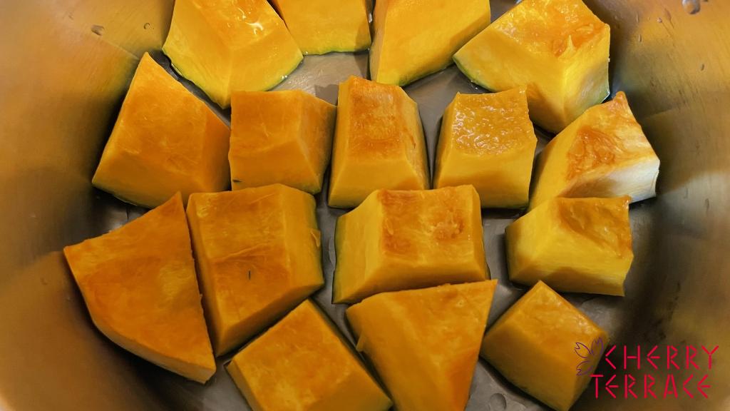 ・かぼちゃはじっくりと加熱することで甘みが強くなるそう。もちろん電子レンジでもできますが、温めるときに水分を飛ばしてしまうので鍋で茹でるほうが甘みも増しておいしく仕上がります。また、電子レンジは急速に加熱されるため、甘みが出にくくなるそうです。