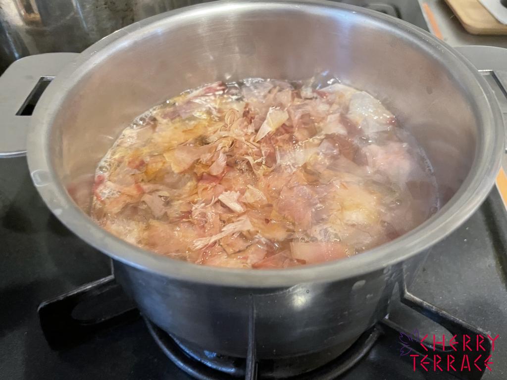 ①クリステル深鍋に水400mlを入れ、沸騰したら鰹節(5g)を入れる。弱火で1〜2分加熱する。