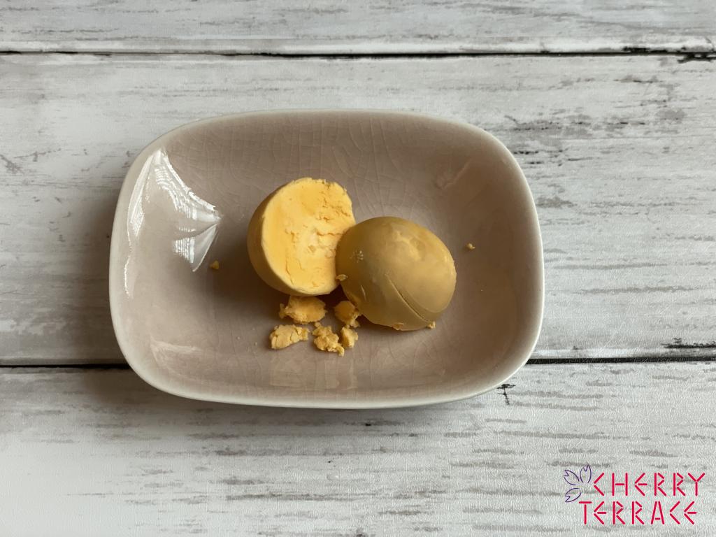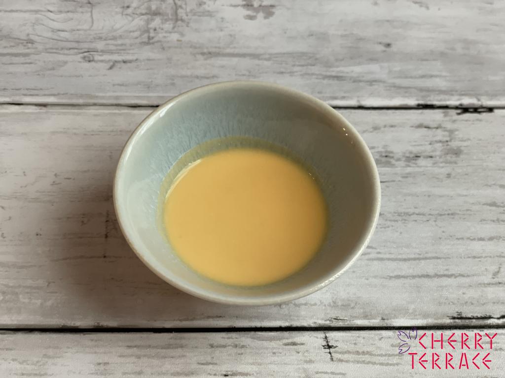 クリステル深鍋で20分しっかり茹でた卵黄1/2個分を出汁大さじ1でペースト状に(スプーンで普通につぶれます)。