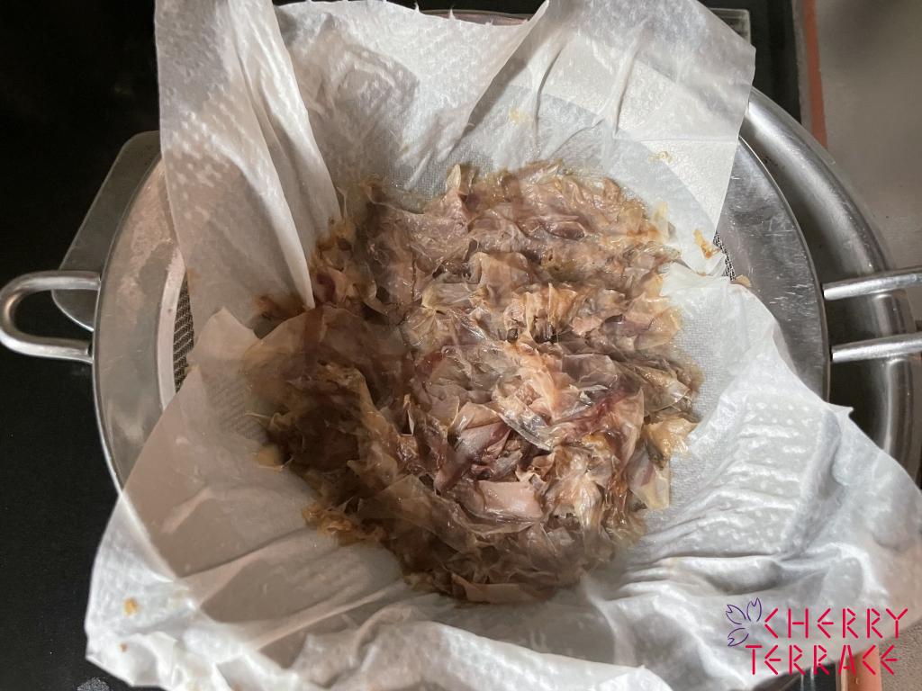 ②火を止めて、鰹節が沈んだらクリステルストレーナーにペーパーを重ねてこす(強く絞らない)。