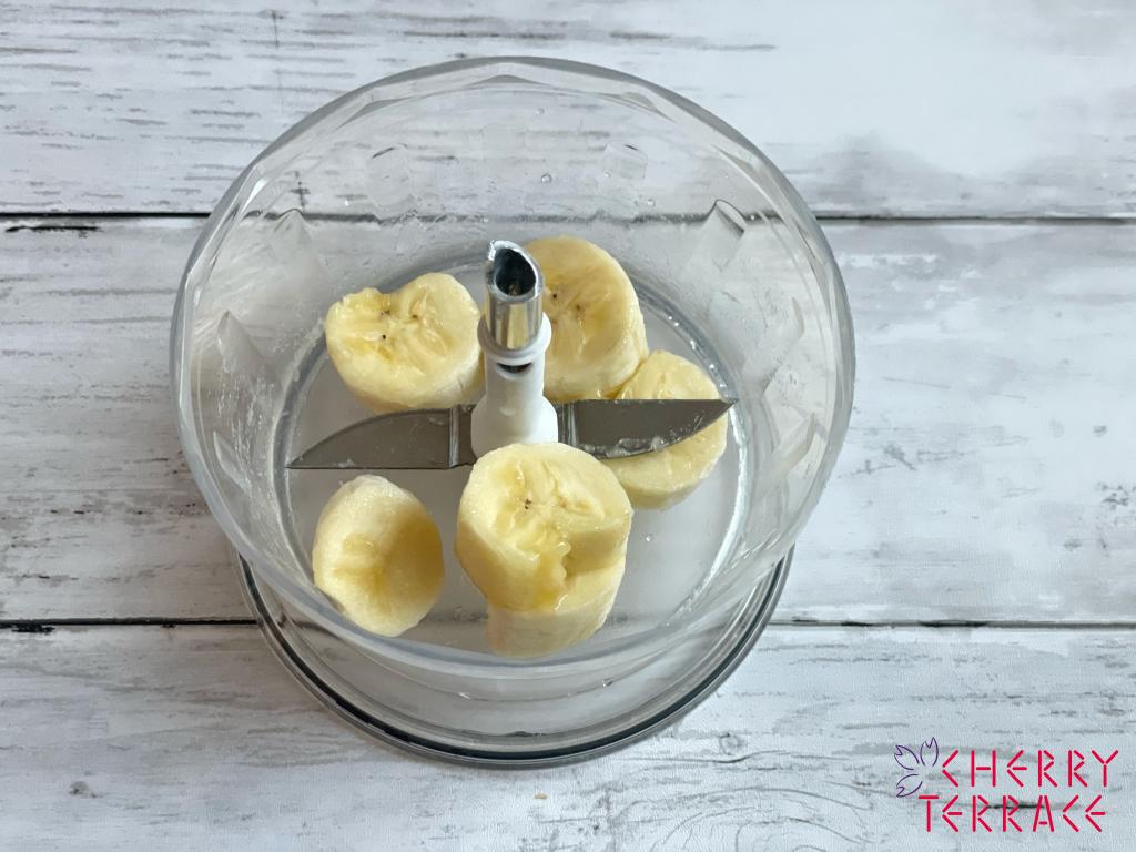 ① バナナ1/2本を切り、バーミックス(ミンサーまたは、グラインダー)でつぶし混ぜる。