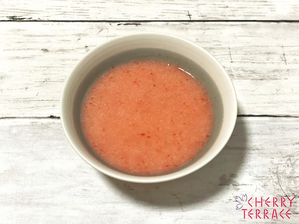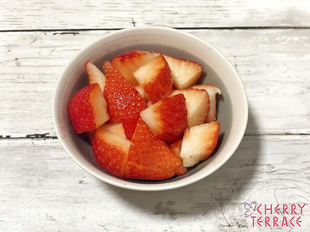 ① いちごのヘタを取り小さめに切って、バーミックス(ミンサー)でなめらかにつぶし混ぜる。