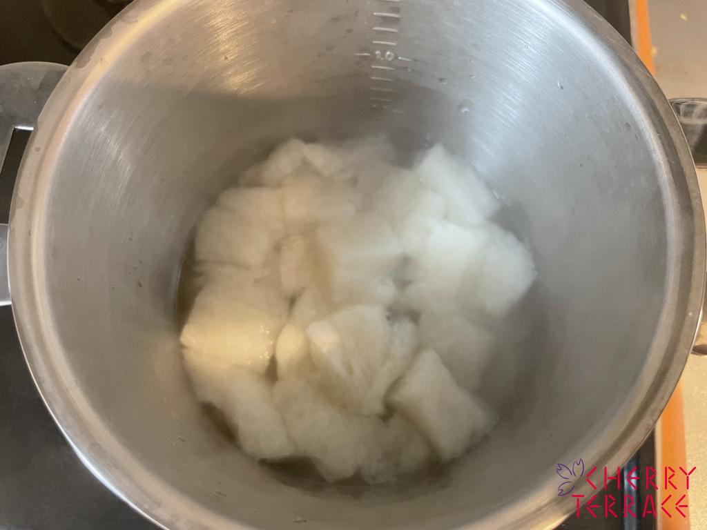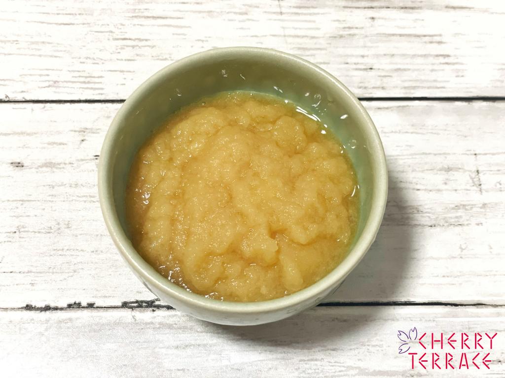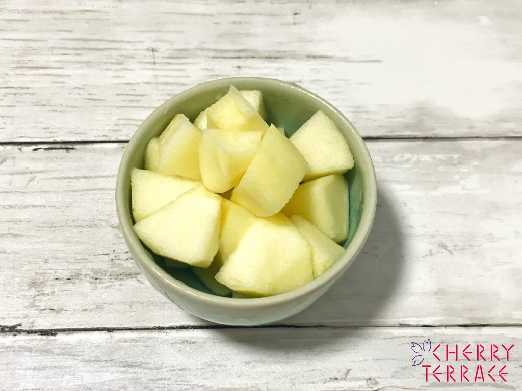① りんごの皮をむき、3cm角程度に切って、バーミックス(ミンサー)でなめらかにつぶし混ぜる。