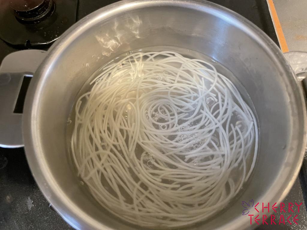 ① クリステル深鍋で表示時間よりプラス5分ほど柔らかくなるまで茹でる(麺は折っても良いです)。