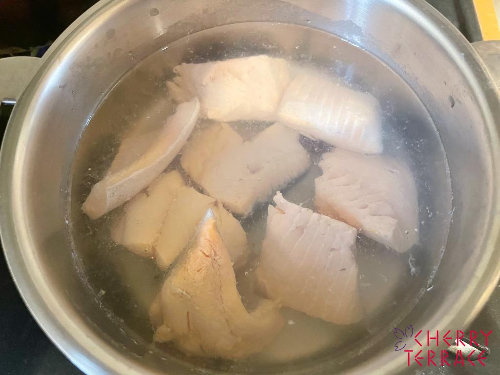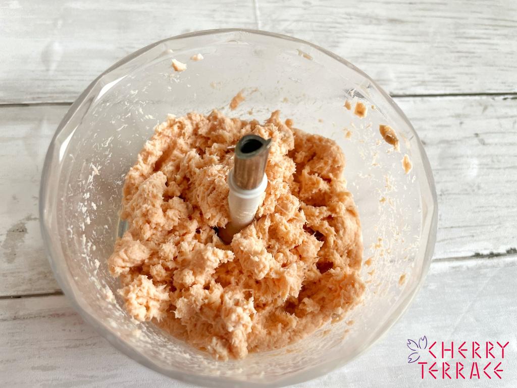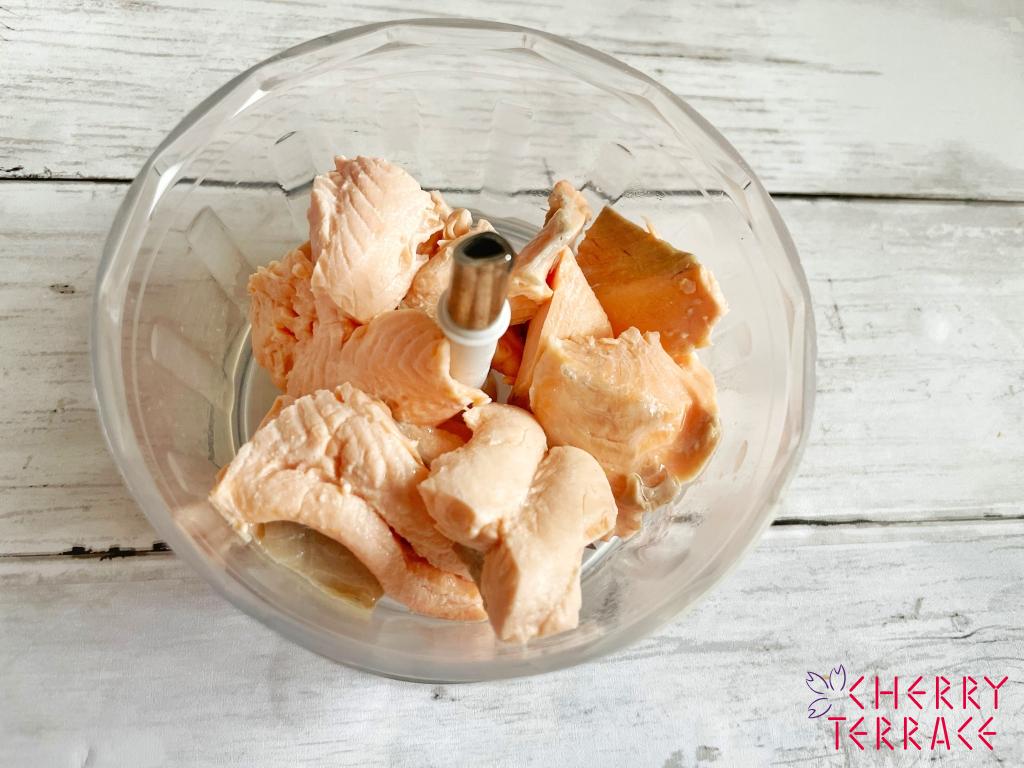 鮭も鯛同様、茹でて中まで火を通してからバーミックス(グラインダー)でつぶします。
