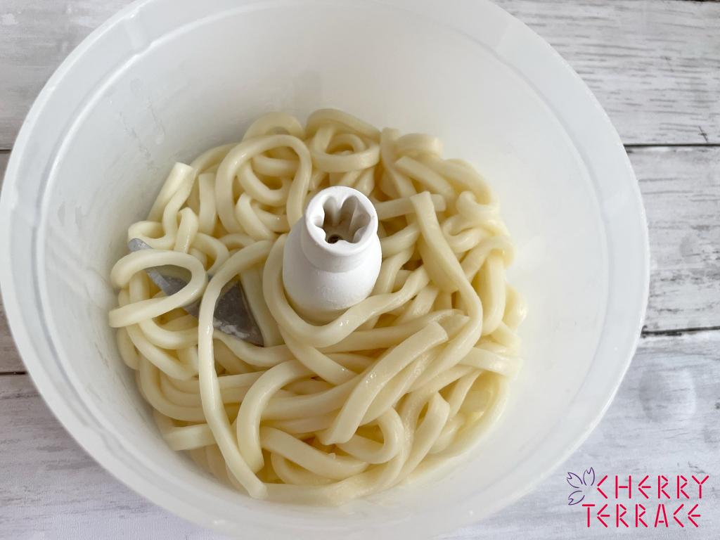 うどんも柔らかくなるまで茹でてスライシーで一気につぶします。